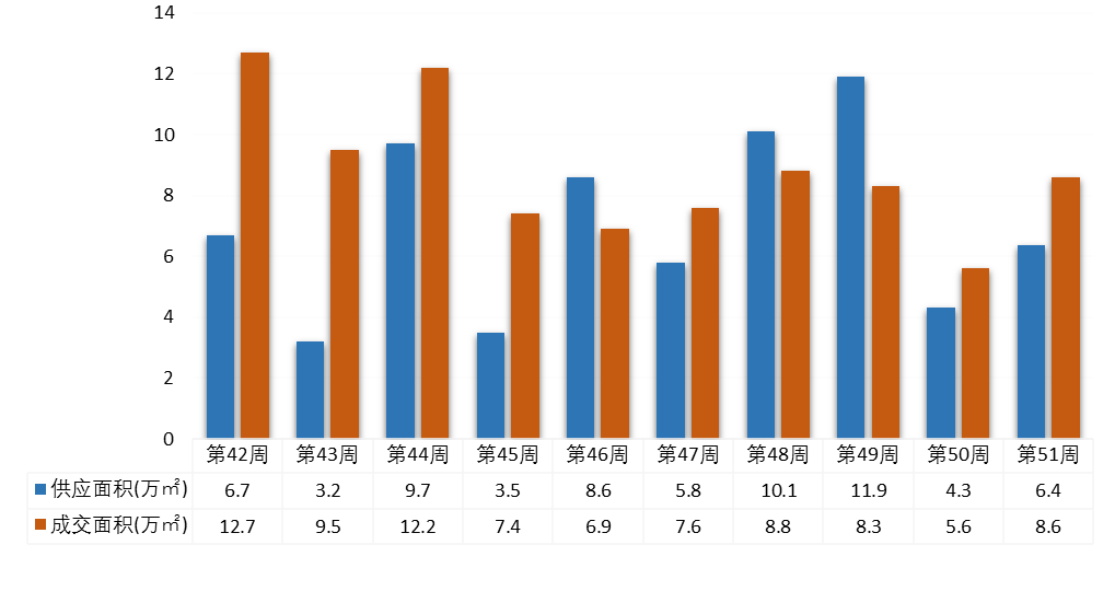 2025年第51周,重庆中心城区商品住宅供应面积约6.4万㎡,成交面积约8.6万㎡,成交均价14012元/㎡。
